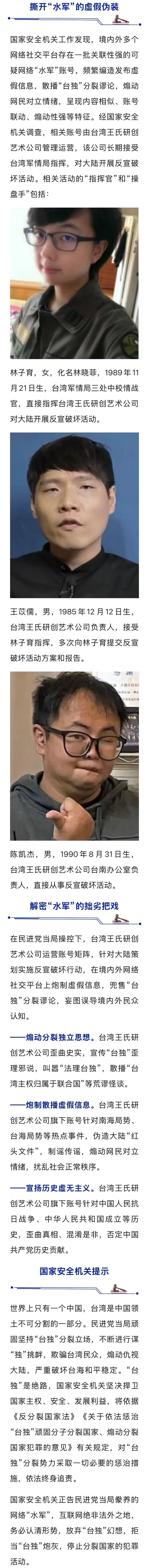 长期以来,民进党当局为推行其“台独”分裂图谋,暗中豢养网络“水军”,潜伏在境内外各类网络社交平台,炮制虚假信息,散播“台独”分裂谬论,蓄意挑起两岸对立对抗、破坏台海和平稳定。台湾王氏研创艺术公司充当民进党当局爪牙,处心积虑、肆无忌惮对大陆开展反宣破坏活动。国家安全机关坚决打击“台独”分裂活动,彻查幕后黑手,肃清危害隐患,坚决捍卫国家安全。